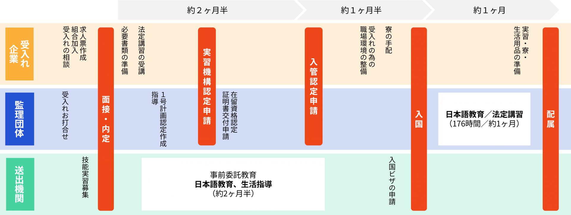 その間「受け入れ企業」「監理団体」「送出機関」が連携して手続きを進めていきます。